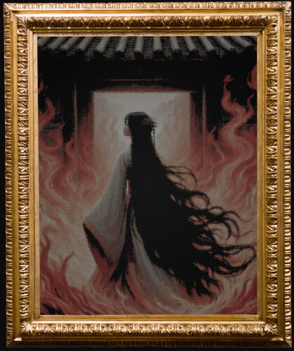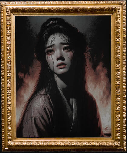 "The Last Gaze of Seonmi"Oil on canvas, 32" x 40" | a delicate portrait, the girl’s eyes brimming with unshed tears, her sorrowful gaze piercing through a world of flames.seher’s paintings feel like memories you’ve never lived but somehow remember. something felt rather than seen. her most famous piece is this self-portrait. she captured every eyelash, every wrinkle in the fabric, every flicker of light with painstaking precision. while painting The Last Gaze of Seonmi, she was in an almost trance-like state, unaware of what she was creating. it wasn’t until she stepped back that she realized she had painted herself. the realization left her unsettled, and she didn’t know why her hands had created it, only that it felt like a memory she couldn’t reach. The Last Gaze of Seonmi would go on to be her most famous work, but to her, it remained a question she could never answer.